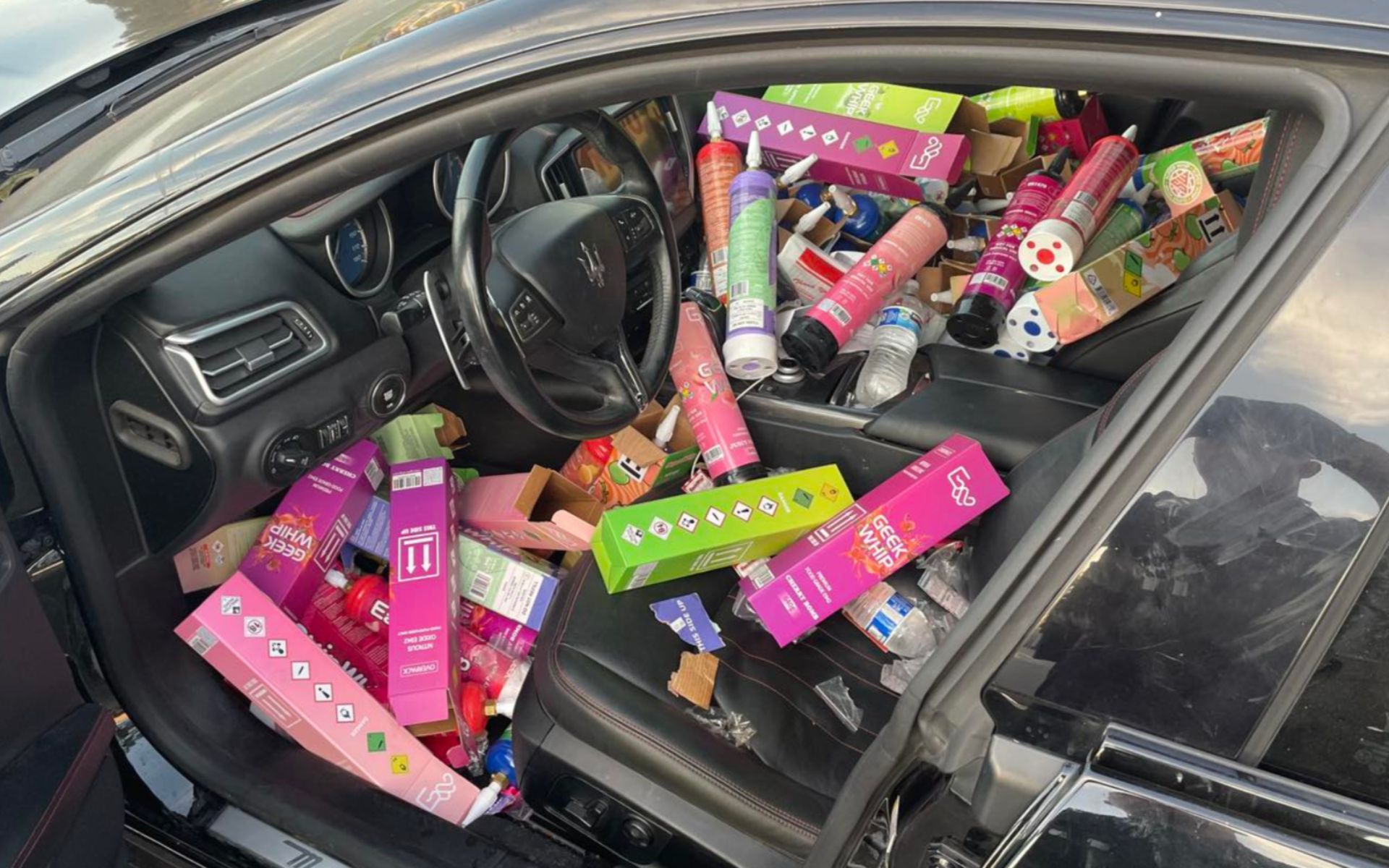 Pictures snapped by the Tustin PD showed the car’s plush interior jam-packed with neon-colored metal tubes, barely leaving space for the driver, much less a passenger. Officers noted the canisters were being illegally possessed and appeared to be prepared for recreational inhalation.