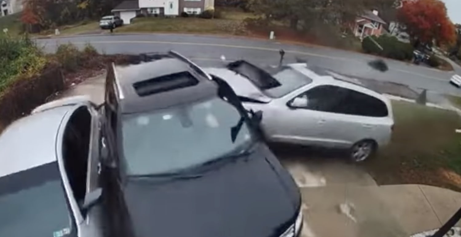 Crunch. The Hyundai clipped a roadside sign, barely slowing down before slamming into a Ford Explorer parked innocently in the driveway. That force? Enough to send the Explorer lurching into a Nissan Altima next to it, finally ending the Santa Fe’s joyride from hell. Both parked rides got wrecked—trunks crumpled, metal twisted, the works.