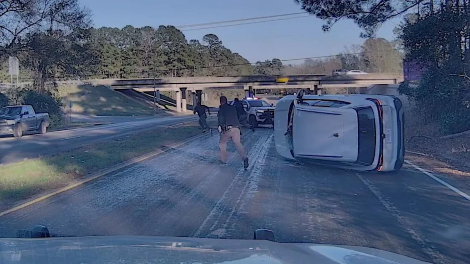 According to the footage, the suspect exited the overturned SUV by smashing through the windshield. After forcing his way out of the vehicle, he immediately fled the scene on foot, continuing his attempt to escape police custody. The dashcam recording captures the urgency of the moment as officers reacted to the sudden transition from a vehicle pursuit to a foot chase.