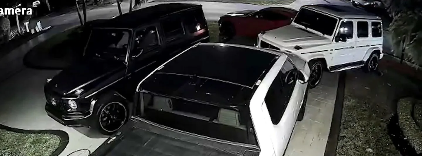 Surveillance footage shows two vehicles circling a home on West Oakmont Drive in Northwest Miami-Dade around 5 a.m. on Sunday, February 1. One of them, a red Camaro, made repeated passes before accelerating backward directly into a white Mercedes G-wagen parked in the driveway. The SUV had reportedly been purchased just three weeks earlier for $185,000.