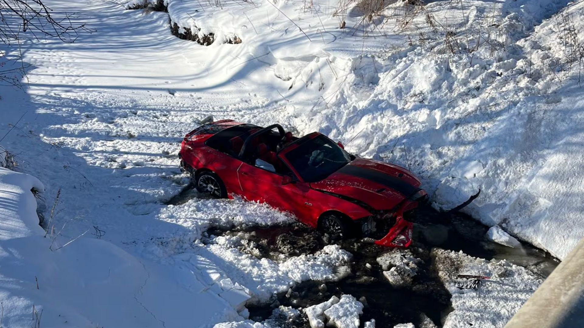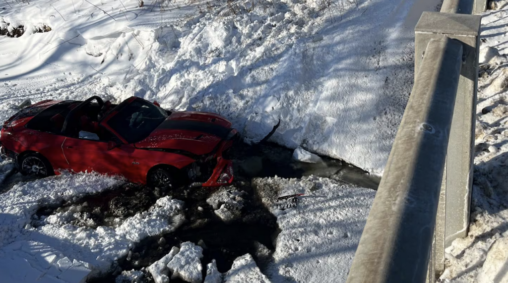 Rescuers had to improvise to get the driver out. With the vehicle stuck upright in the creek, crews instructed the driver to lower the convertible top. A roof ladder from an arriving fire engine was then used to help him climb out. This was not a routine roadside assist. It was a full emergency response triggered by a moment that should never have happened in the first place.