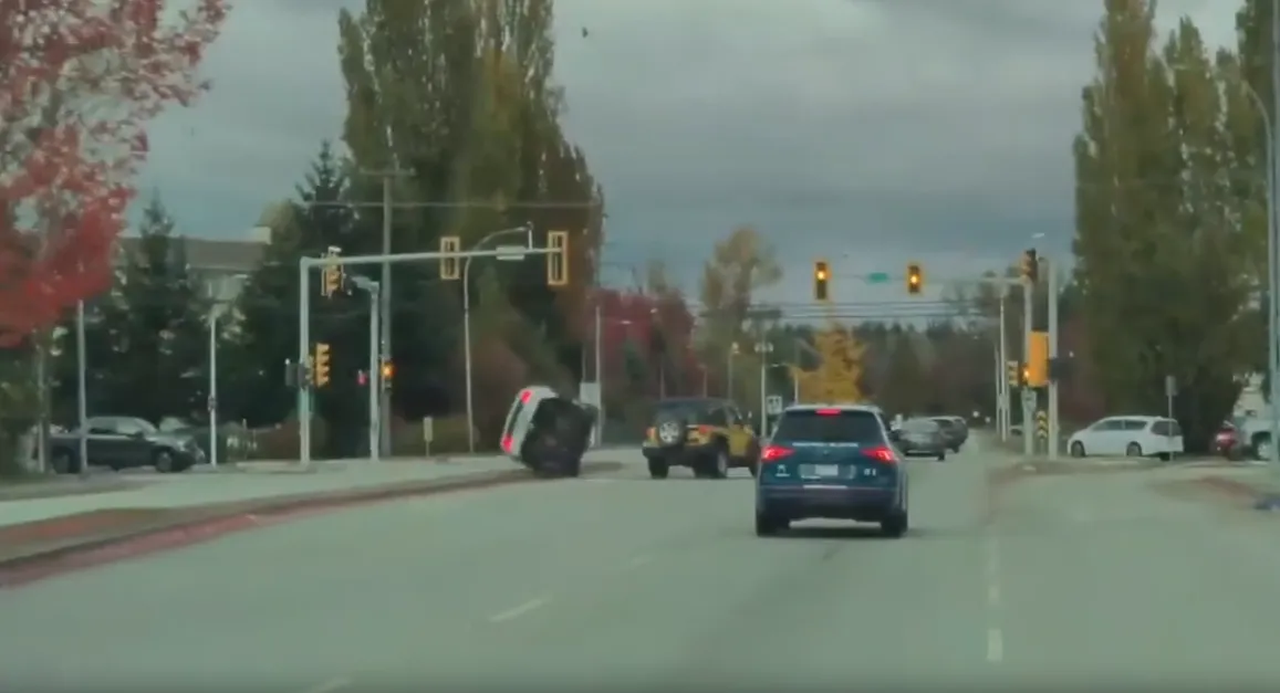 Mustang Flips Over Median After Sudden Jeep Maneuver